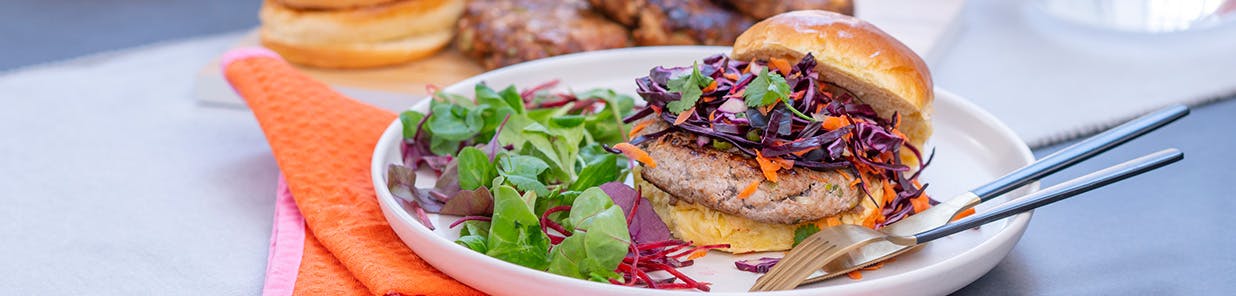 These burgers are so easy to make and are a lovely variation on the classic beef burger. They are a great one to batch cook as they freeze really well - simply layer them up with greaseproof paper to make sure they don't stick together. The slaw gives a lovely crunch - this can't be frozen, but it takes next-to-no time to make!