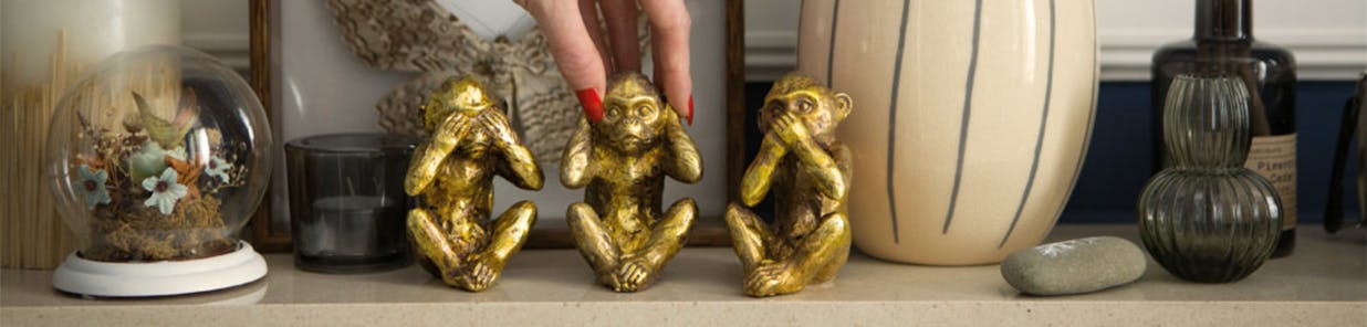 - Employ the rule of ‘different but the same’ and group items together by finding some commonality between them. Colour, size, texture, theme: find a way to form collections and suddenly your mish-mash of items becomes an intriguing display piece. (This works particularly well for smaller items.)