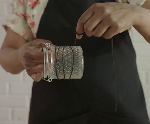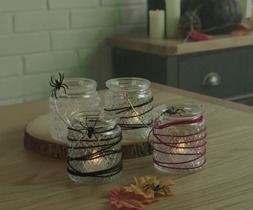 4. Place an LED tea light inside the jar and finish off with a plastic spider clinging to the string web.