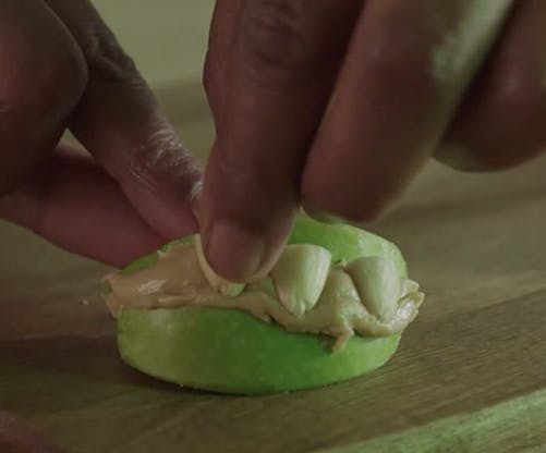 2. Apply a spoonful of peanut butter to one slice, and attach a second slice.