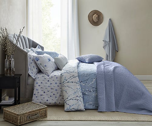 Beautiful and effortlessly fresh, these two bedding ranges will bring a touch of the outdoors into your bedroom with calming blues and crisp whites. Layered together, you can see how stunning the designs are and really make you feel like spring is just around the corner. A fun touch to both bedding sets is that they are completely reversible which means you can swap and change as much as you like to revamp your space. Our new textured Bloom Blue accessories and long white cushion match with both designs perfectly, and really brings out the blue detailing of the flowers to bring the whole look together. If you fancy an extra comfy touch, both styles are also available in 100% cotton as well as our original polycotton blend.