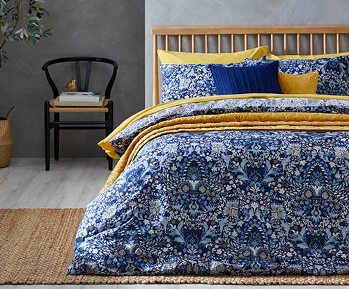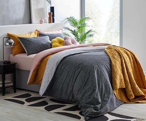 Classic and contemporary, these two ranges layer up beautifully to truly show off their stunning patterns and bold colours. Designed with midnight blue and bright ochre, the detailed pattern of the Hardwick bedding range is as stunning to look at as it is comfy to sleep in. We have styled it with the yellow waffle 100% cotton Chester range that pulls the pops of ochre from the Hardwick detailing to highlight how bright and mood-lifting the bedding is. If you want to further add to the look, our Stem Velvet bedspread and Navy Channel cushion add yet another layer of colour and inviting style that will make your bed a statement piece.