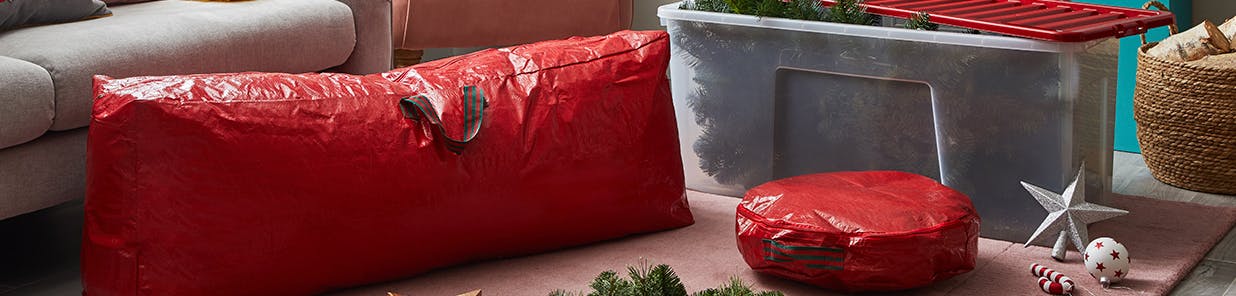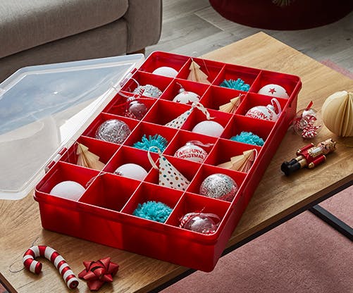 No one wants a pile of dusty, fiddly bags and boxes to ferry down from the loft, so for an easy, no-mess alternative pop everything in a couple of clear plastic boxes. You’ll be able to see exactly what’s inside and they’re ideal for stacking and storing all your Christmas goodies.