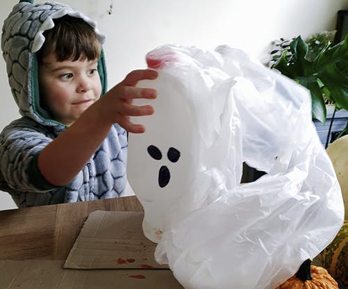 2. We then placed a white bin bag over the top, screwed the lid over the bin bag and started to rip at the base of the bottle (Zac loved this bit because the more he ripped the more ghostly they looked!)