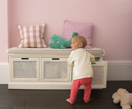 This could mean anything from swapping your delicate fluffy-fibre rug for a more hard-wearing but still super soft and shaggy synthetic rug, or you might want to ditch the long pile altogether. Something short or woven makes crumb removal much easier, and won’t harbour hidden building blocks or globs of playdough, and a patterned option will help hide any accidental marks.