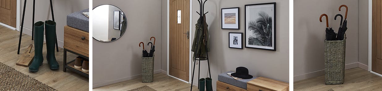 First off let's talk about you, and making sure your waterproof jacket, umbrella, wellies, hats and gloves are on hand so you're not losing precious time scavenging through coat racks and shoe boxes. It's frustrating at the best of times, and we don't need to tell you the impact unplanned rummaging will have when combined with the time pressure of school runs and commutes. So, make sure your outerwear area is streamlined for success with everyone's stuff neatly stored so it's a grab and go situation should the forecast take a turn for the moist. Our hero pieces for this are coat hangers or stands, show racks, storage baskets, and even a storage bench if your space allows for it.