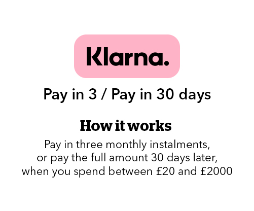 Klarna's Pay in 3 is an unregulated credit agreement. Borrowing more than you can afford or paying late may negatively impact your financial status and ability to obtain credit. 18+, UK residents only. Subject to status. T&Cs and late fees apply