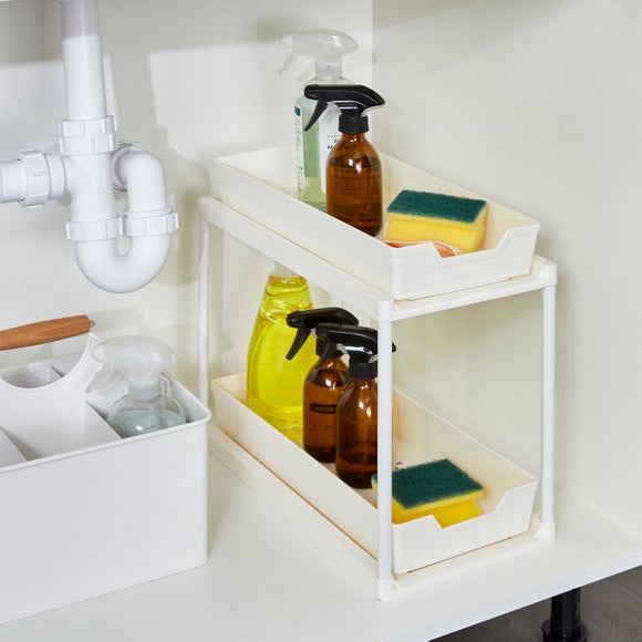 Maximise hidden storage with the 2 Tier Under Sink Organiser with Drawers, a smart solution for clutter-free living. Featuring a smooth sliding bottom drawer, it offers easy access to essentials even in tight spaces. Made from waterproof, rust-resistant ABS, it’s ideal for kitchens, bathrooms, pantries, and more. No tools needed, simply snap the support tubes into place for quick setup. Easy to clean and built to last, this organiser keeps everything from cleaning supplies to toiletries neatly tucked away and within reach.