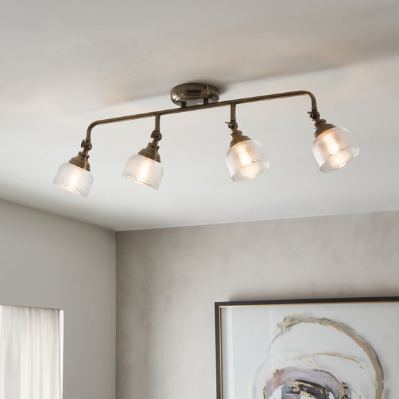 The Amesbury Industrial 4 Light Adjustable Spotlight Bar brings a refined workshop aesthetic to ceilings, combining prismatic glass shades with adjustable knuckles for tailored lighting across the room. Dimmable with a compatible bulb and switch; complete the look with matching Amesbury family items.
