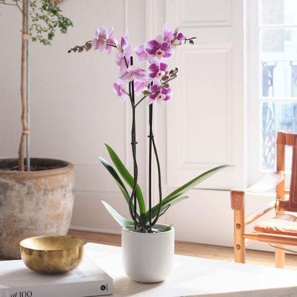 Despite its bold presence, the Barcelona Orchid is refreshingly easy to care for. Originating from tropical climates where orchids grow in dappled light, this variety thrives in bright but indirect conditions. Its velvety blooms echo the vibrancy of its heritage, offering weeks of long-lasting colour and character. Water lightly only when the soil begins to dry out, and it will continue to flourish with little fuss. Paired with a perfectly fitting ceramic pot.