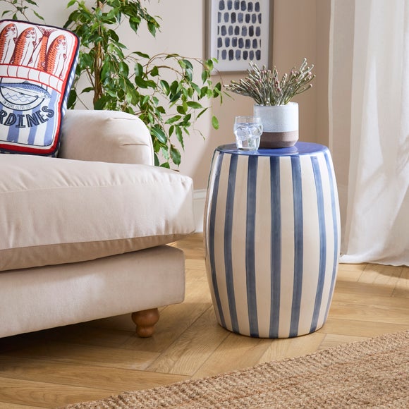 Introducing the Beatrice Striped Ceramic Side Table. This versatile piece is a wonderful addition to any living space. With its compact size and durable ceramic construction, it's ideal for use as a plant stand, side table or accent in your home. With its hand painted striped finish, each piece is subtly different, giving it an artisanal quality.