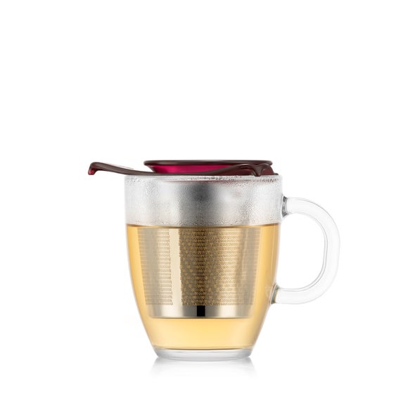 Discover the Bodum Yo Yo Mug and Tea Strainer Set. Designed for loose-leaf tea lovers, the stainless steel strainer and tempered glass mug make brewing simple and stylish. The lid keeps your tea warm and doubles as a drip-free trivet.