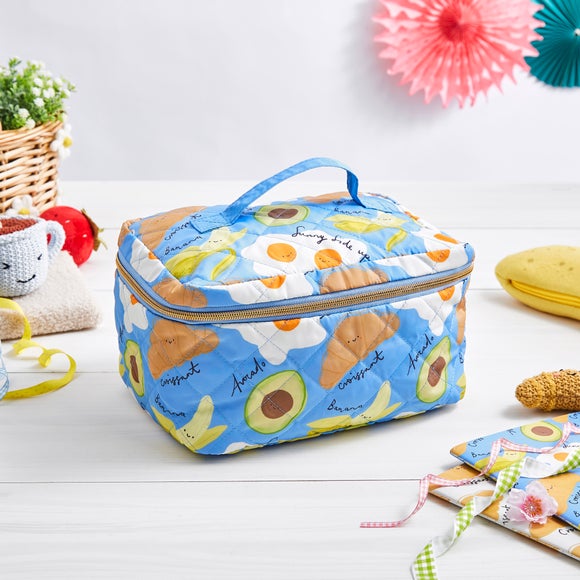 Travel in style with the Brunch Blue Quilted Wash Bag, featuring a playful brunch-themed design with eggs, bananas and avocados. Its quilted finish adds a premium feel, while the secure zip closure and water-repellent lining keep your essentials protected. Complete with a convenient handle for easy carrying.