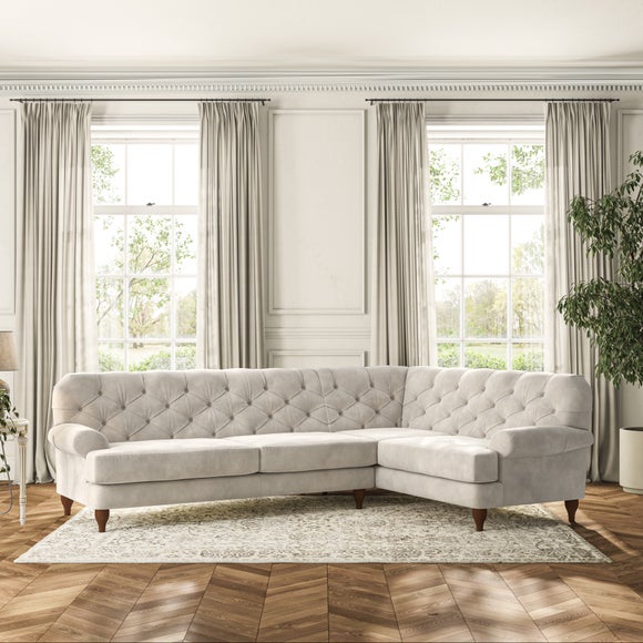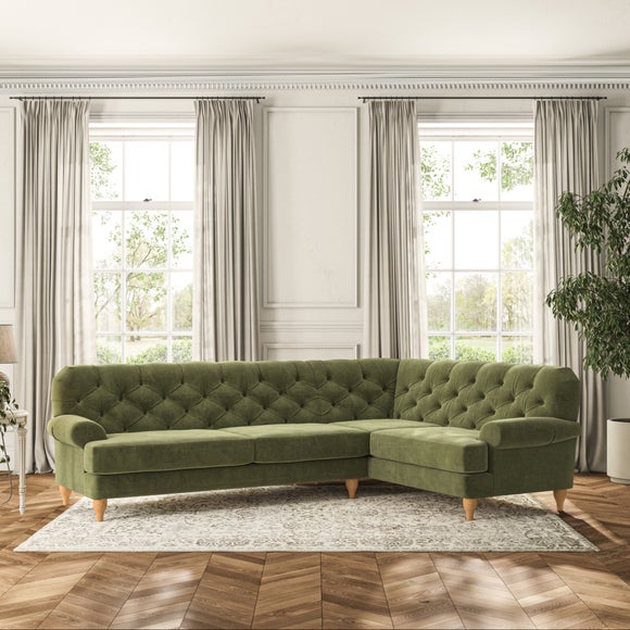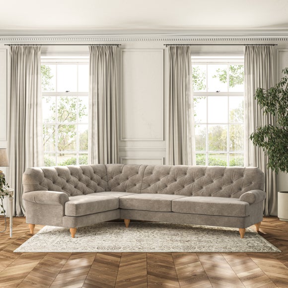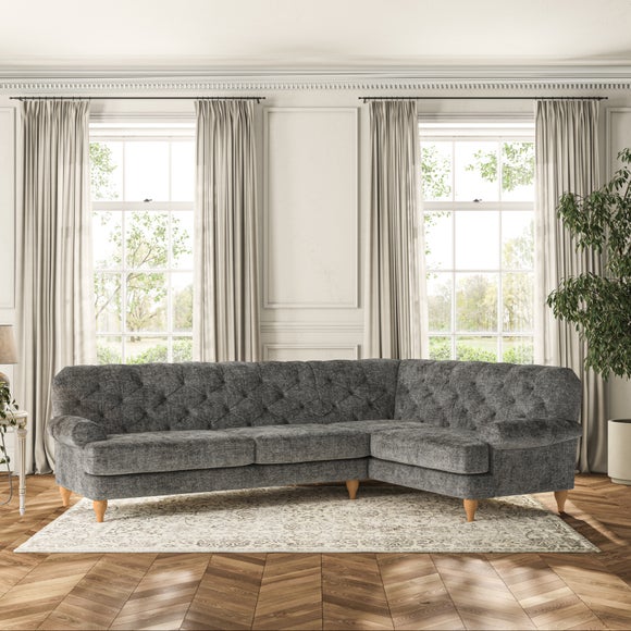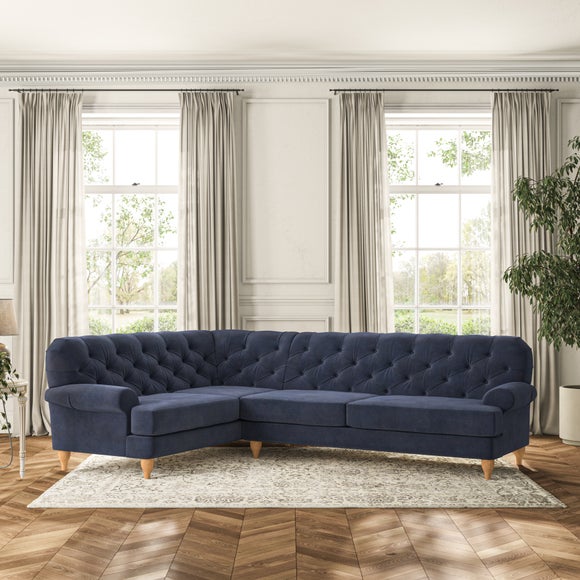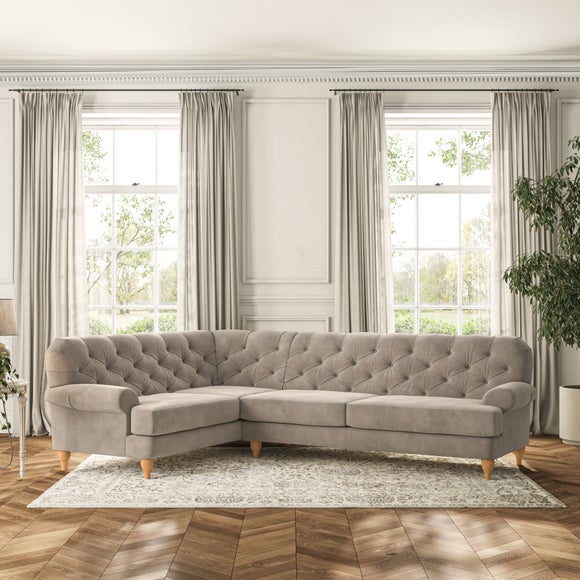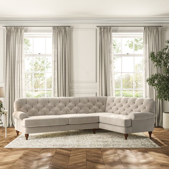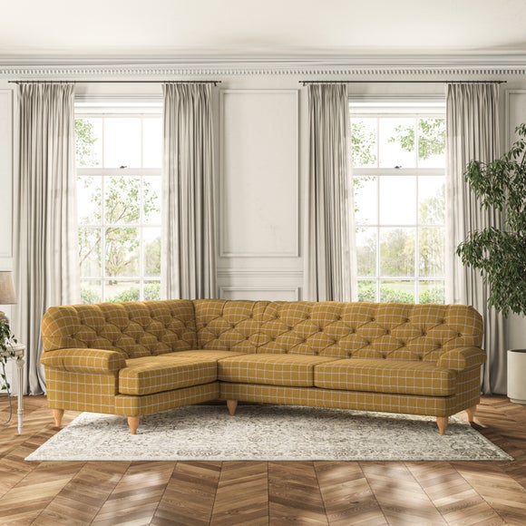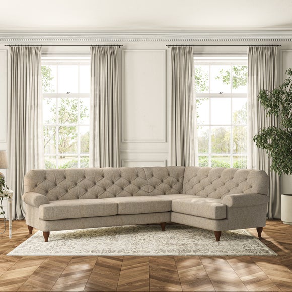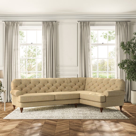 This sofa boasts a high, supportive back and elegant compact scroll arms, providing both style and comfort. The serpentine seat springs and superloop sprung back ensure lasting durability and support. Choose between a low-maintenance foam seat or the inviting ‘Qualofill Blue’ fibre seat, crafted from 100% recycled polyester. The ‘T’ cushion seat and arm design offer a compact and contemporary look, enhanced by self-sewn seat cushions. Available as a right or left-handed corner group, this sofa also features ‘hour glass’ shaped turned hardwood legs in two finishes, which are easy to fit.