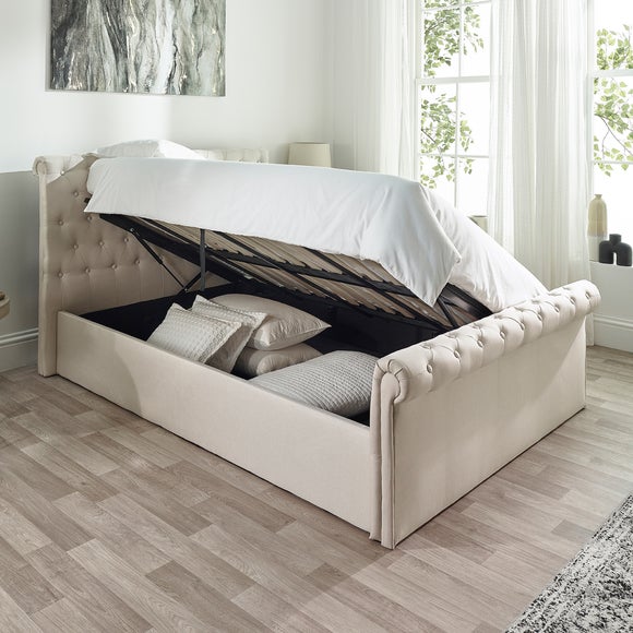 This bed frame is upholstered in a luxurious linen fabric, combining classic elegance with smart functionality. The scroll top design exudes timeless Chesterfield charm, making it a standout piece in any bedroom. The bed features a versatile side-lift ottoman mechanism that can be configured to open from either the left or right, providing easy access to a spacious under-bed storage area.