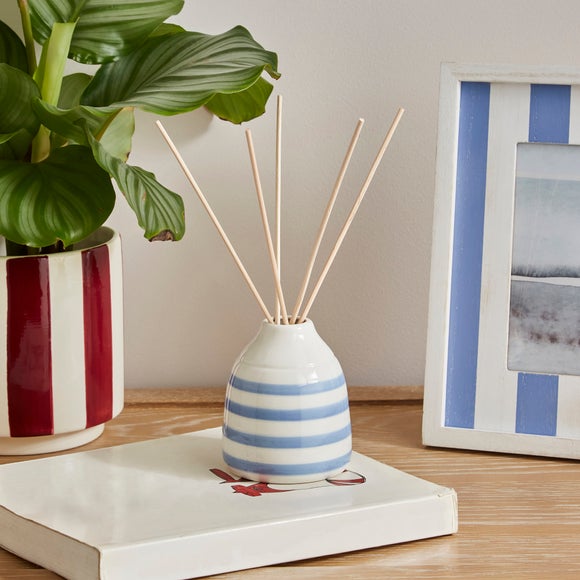 Fill your home with the uplifting scent of the sea with this 100ml Coastal Air Striped Ceramic Diffuser. The hand‑painted ceramic design brings effortless style, making it as decorative as it is functional, whilst its fresh, invigorating fragrance creates a calm and airy atmosphere in any room. Complete with reeds for an even, long‑lasting scent release, it’s an ideal finishing touch for shelves, bedside tables, or bathroom counters.