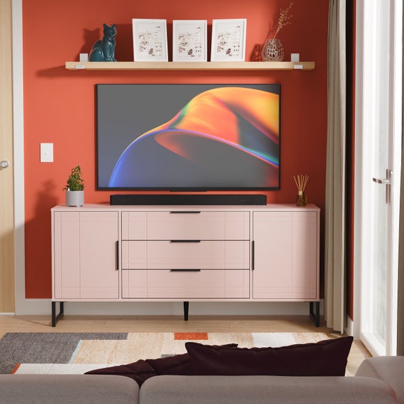 The Darlton sideboard offers a generous mix of storage and style, featuring two spacious cupboards and three soft-close drawers for everyday organisation. Built to order in the UK and delivered fully assembled, it’s finished with a scratch-resistant surface and showcases distinctive grid-pattern carved fronts for added texture. Sleigh legs and metal handles, available in gold or black, provide a refined accent that can be tailored to suit your space. Suitable for use as a media unit for TVs up to 70", it’s a versatile piece designed to complement contemporary interiors.
