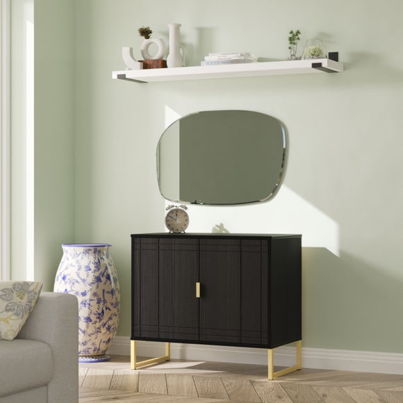 The Darlton sideboard offers compact yet practical storage with a double cupboard concealed behind soft-close doors. Built to order in the UK and delivered fully assembled, it features a scratch-resistant finish and distinctive grid-pattern carved fronts for added texture. Sleigh legs and metal handles, available in gold or black, provide a refined accent that can be tailored to suit your space. Suitable for use as a media unit for TVs up to 40", it’s a versatile piece designed to complement contemporary interiors.