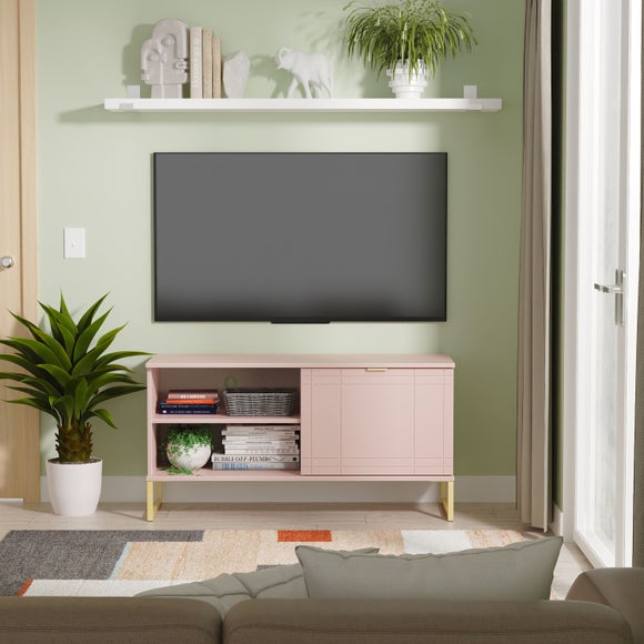 The small Darlton TV unit is built to order in the UK and delivered fully assembled, offering a compact yet practical solution for screens up to 50". It features a single storage cupboard and double shelves with a cable hole for neat organisation of media devices. A scratch-resistant finish and grid-pattern carved fronts add texture and durability, while gold or black metal handles and sleigh legs provide a refined accent to suit your space.