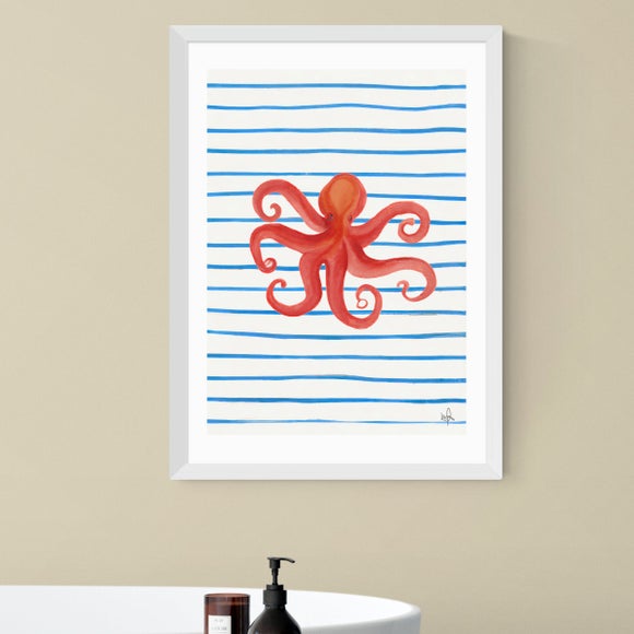 A playful illustrated octopus set against bold blue stripes, bringing a fresh coastal feel to your space. The loose, painterly style and vibrant colour contrast create a fun yet modern look, perfect for bathrooms, kitchens, or relaxed living areas.