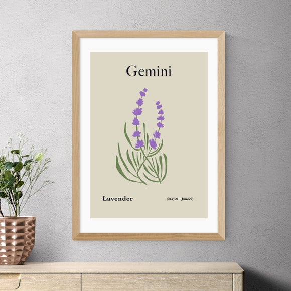 Add a touch of elegance with this sage-green print featuring lavender, inspired by the Gemini star sign. Choose your preferred frame and size for a personalised touch.
