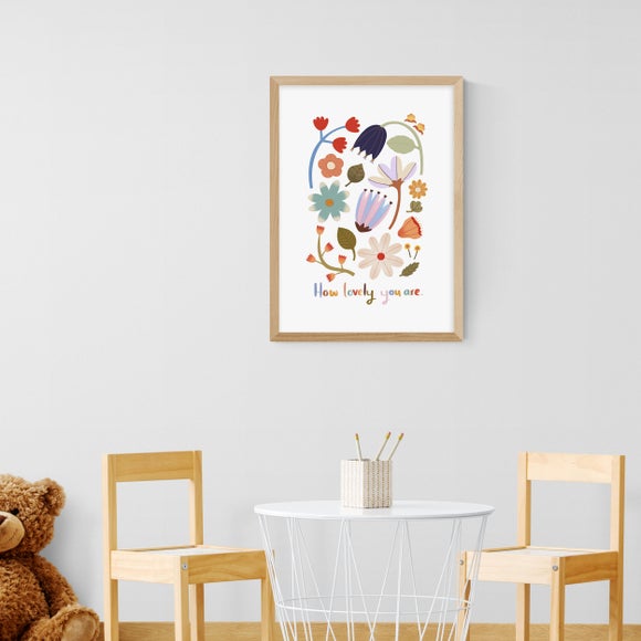 Fill your walls with this blooming beautiful print by Kid of the Village featuring a range of delightful florals in an illustrative style and a positive “how lovely you are” statement. This print is made to last as it uses a Giclee printing process to stay vibrant and prevent fading over years. Each design is available in four print sizes and a variety of frame options, including unframed, so you can display your artwork however you wish.