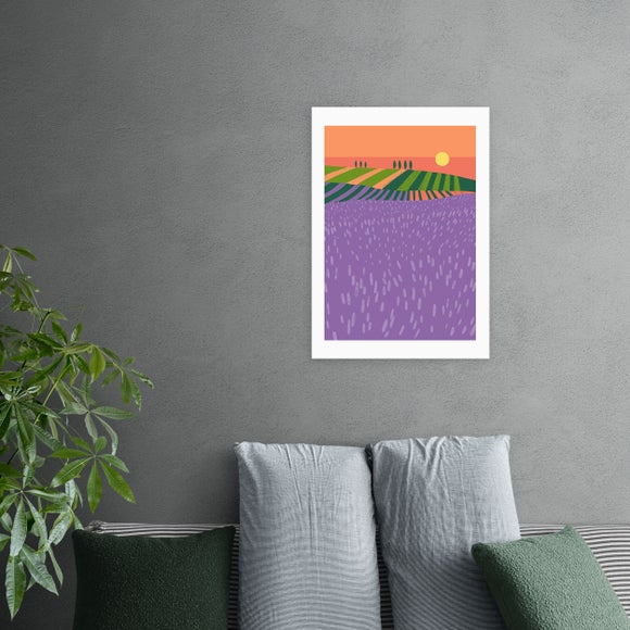 Transport yourself to vibrant purple fields of lavender and contrasting coral sunsets with this landscape scene by Anek. Made using a Giclee printing process to prevent fading, this wonderful print is ideal for a living space or hallway and will stay vibrant for years to come. Each design is available in four print sizes and a variety of frame options, including unframed, so you can display your artwork however you wish.