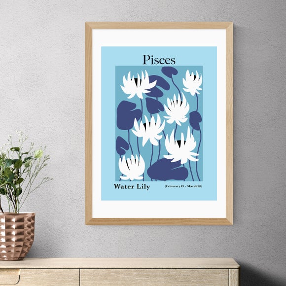 Create a tranquil atmosphere with this serene blue print of water lilies, inspired by the Pisces star sign. Customise your piece by choosing from various frame and size options.
