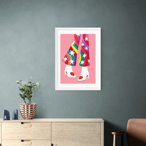 Dance back in time with "Rainbow Pants" by Keren Parmley. This nostalgic print, adorned with rainbows and stars, invites you to put on your dancing shoes and embrace the joy of yesteryears.