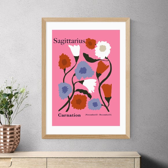 Brighten your home with this pink-themed print of carnations, inspired by the Sagittarius star sign. Select the perfect frame and size to suit your decor.