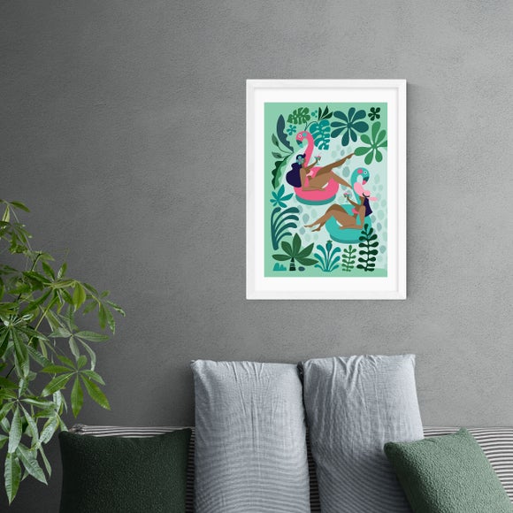 Enjoy pool party fun all year round with this bright and playful illustrative print, featuring two bronzed girls in a pool, on inflatables and captured amongst pretty floral shapes. Made using a Giclee printing process to prevent fading, this wonderful print will stay vibrant for years to come. Each design is available in four print sizes and a variety of frame options, including unframed, so you can display your artwork however you wish.