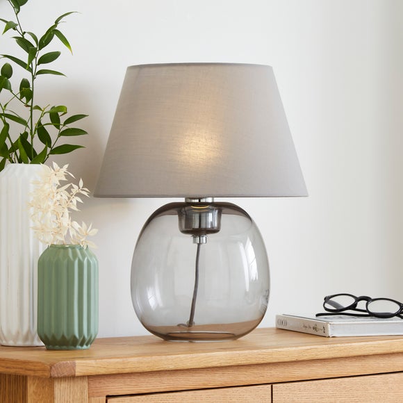The Edin Glass Table Lamp features a beautifully curved glass base with a soft, elegant shape and a distinctive top detail. Paired with a coordinating fabric shade and fabric flex, it brings a sophisticated touch to any space.