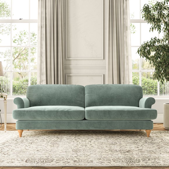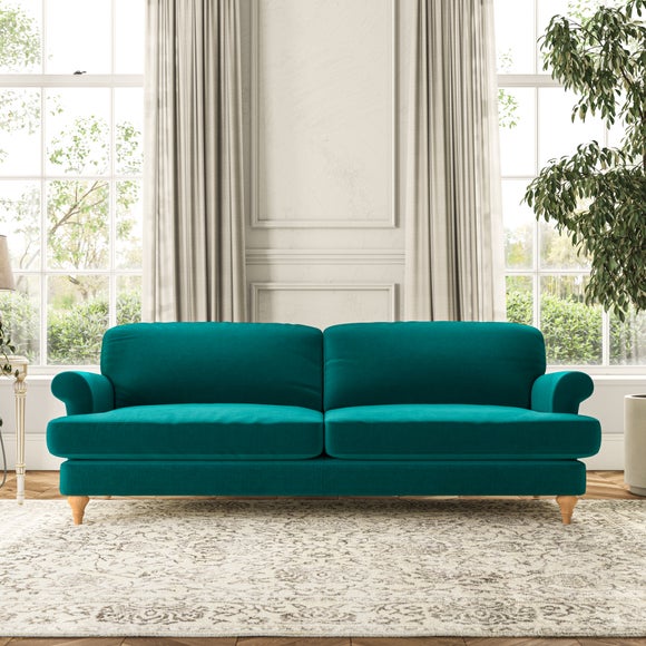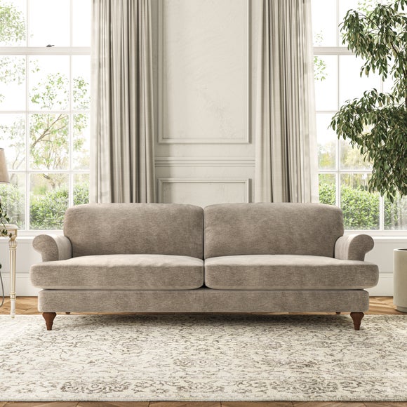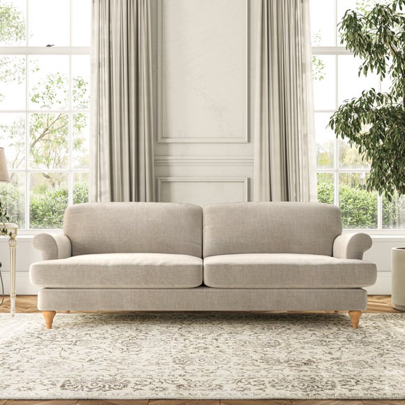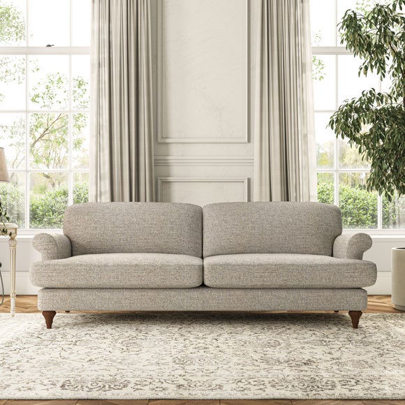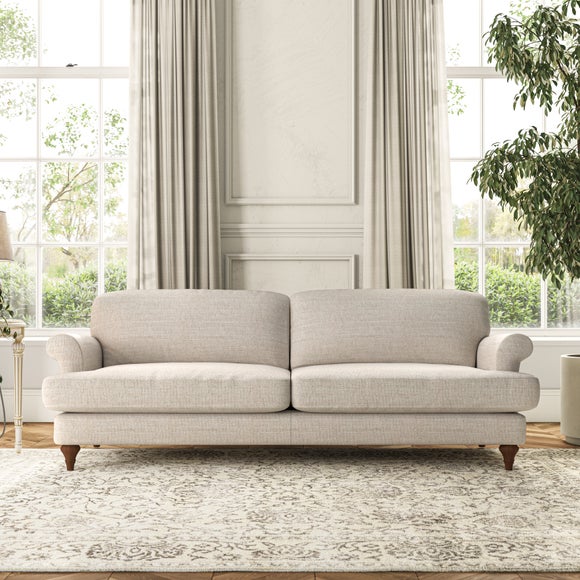 The Evie 4 Seater Sofa combines generous seating space with refined design, making it an ideal choice for larger living rooms. Featuring slender scroll arms and lugged seat cushions, this sofa offers a classic look with a modern touch. The fibre-filled back cushions provide excellent support, making it a comfortable choice for family gatherings or quiet evenings at home. Choose from a wide range of fabrics, colours, cushion fillings, and leg finishes to personalise this piece.