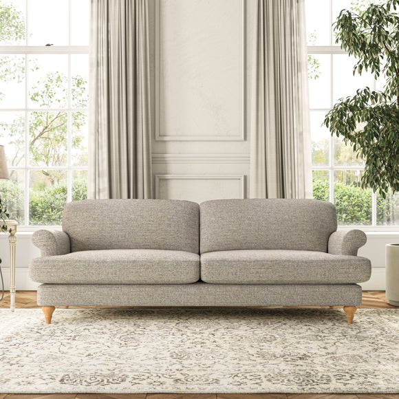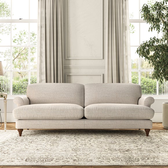 The Evie 4 Seater Sofa combines generous seating space with refined design, making it an ideal choice for larger living rooms. Featuring slender scroll arms and lugged seat cushions, this sofa offers a classic look with a modern touch. The fibre-filled back cushions provide excellent support, making it a comfortable choice for family gatherings or quiet evenings at home. Choose from a wide range of fabrics, colours, cushion fillings, and leg finishes to personalise this piece.