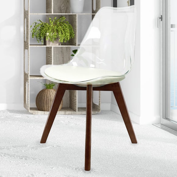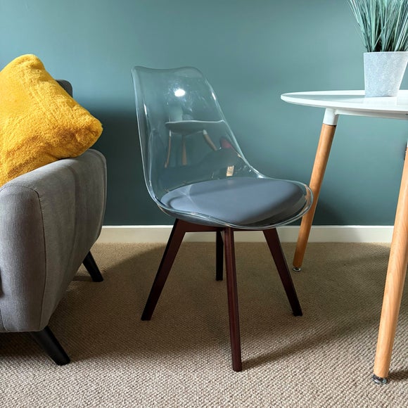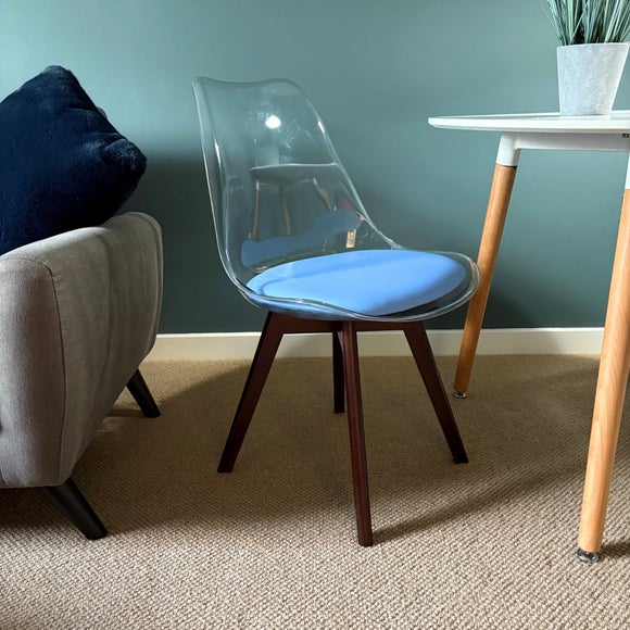 Part of a collection that effortlessly blends design and practicality, this chair features a transparent plastic curvaceous seat and a soft, easy-to-clean, colourful seat pad, making it both stylish and comfortable. The contoured, clear seat and four squared light wood legs not only look great but also provide exceptional sturdiness.