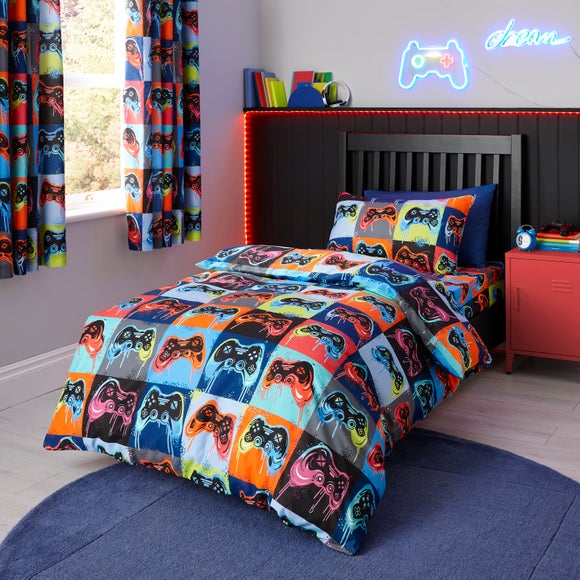 Press play on the ultimate bedtime adventure with our Game Mode Duvet Cover and Pillowcase Set! Bursting with bold, colourful game consoles, this fun design is perfect for mini gamers who dream in pixels. Made from a soft, breathable polycotton blend, it’s comfy, durable, and easy to care for, ideal for busy households. Flip it over for a fresh look with its reversible design and keep it looking great with quick, fuss-free washes. Pair with matching items to create the coolest gaming zone ever. Ready, player one? It’s time to power up your room!