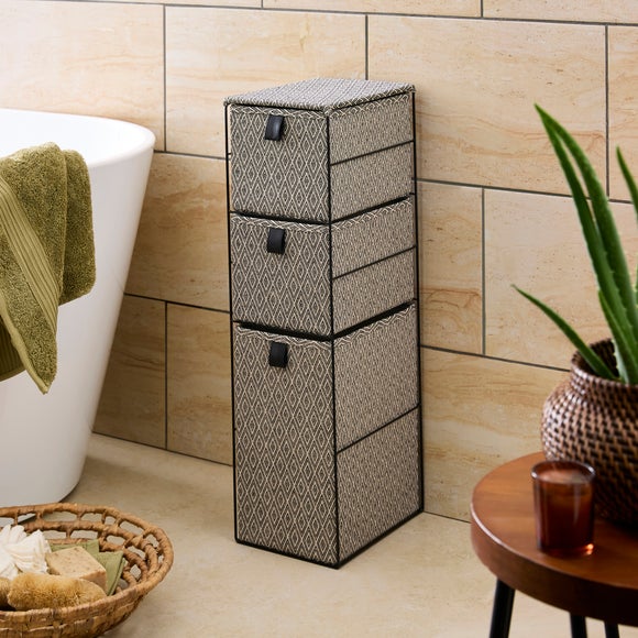 Keep your bathroom essentials neatly organised with this three-drawer storage tower. Its slim design fits perfectly into smaller spaces, while the patterned finish adds a modern touch. Built with a strong metal frame, it offers reliable support for toiletries and everyday items. Each drawer provides easy access, helping you maintain a tidy and clutter-free bathroom. Ideal for storing towels, beauty products, and more.