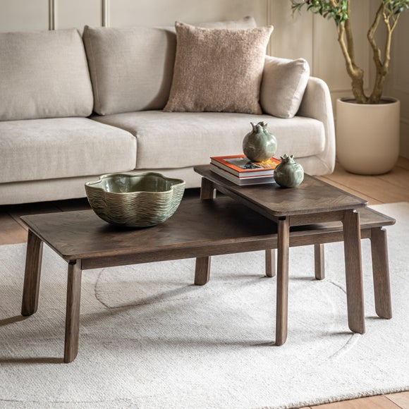 Stylish and versatile, the Hanley Nesting Coffee Tables bring both form and function to your living room. Featuring a refined herringbone pattern and beautifully turned legs, these tables can be nested together to save space or separated to create flexible surfaces around the room. A timeless design that feels both classic and contemporary.