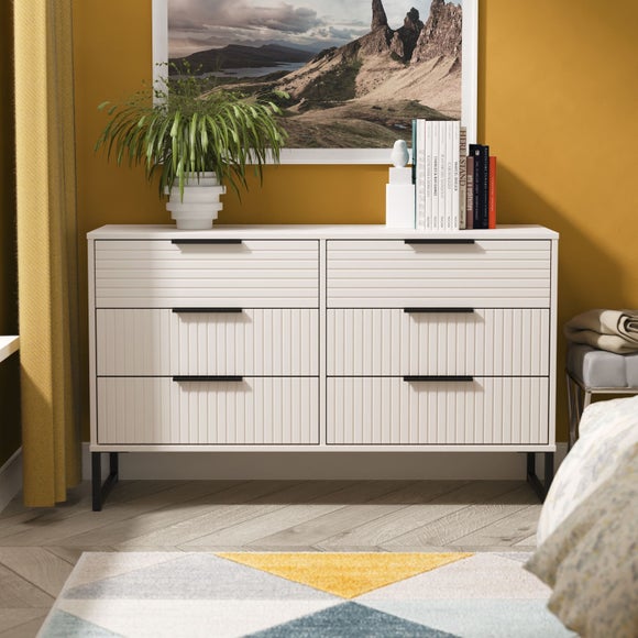 The Harborne chest of drawers offers generous horizontal storage with six soft-close drawers, combining everyday functionality with refined design. Built to order in the UK and delivered fully assembled, it’s finished with a scratch-resistant surface and showcases lined-pattern carved fronts for added texture. Gold or black metal handles and sleigh legs provide a tailored accent to suit your space.