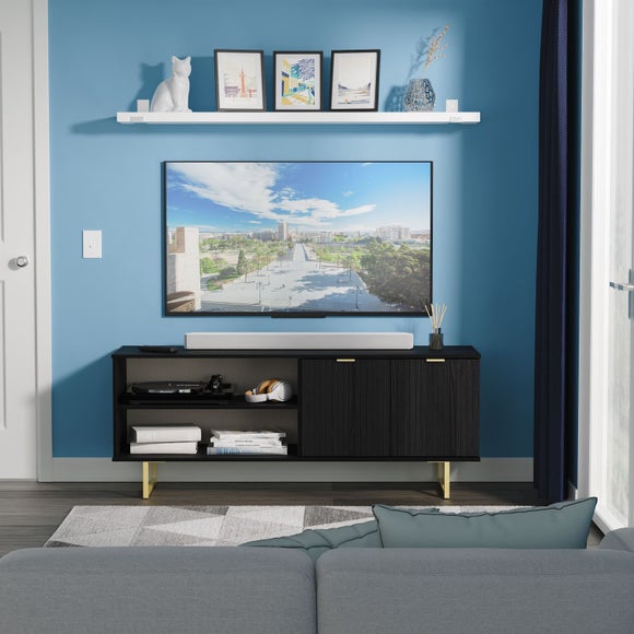 The wide Harborne TV unit offers a spacious platform for screens up to 65", with a double-door storage cupboard and open shelving for media accessories. A cable hole ensures neat wire management, while the scratch-resistant finish and lined-pattern carved fronts add a modern touch. Built to order in the UK and delivered fully assembled, it’s completed with gold or black metal handles and sleigh legs to suit your space.