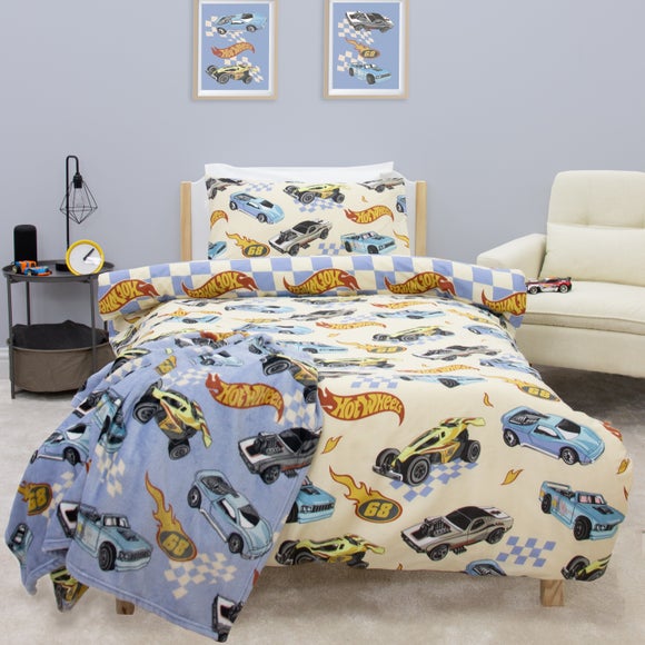 Rev up bedtime with our Hot Wheels Quilt Cover and Pillowcase Set! Perfect for young racing fans, this officially licensed design brings high-speed style to any bedroom. The front features a bold mix of Hot Wheels cars, logos, and racing chequerboards on a cream backdrop, ideal for little speedsters. Flip it over for a fresh look with a blue and cream chequerboard pattern and repeating logos, giving you two dynamic styles in one. Made from a polycotton blend, it's soft, durable and easy to care for. Complete with button fasteners for fuss-free changes, this set is ready to race into dreamland.