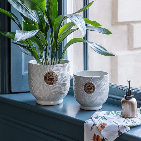 Enhance your indoor garden with the Kew Leaf Embossed Ivory Cork Planter, available in a range of sizes and colours. Its elegant leaf pattern and cork Kew logo are finished with a stunning reactive glaze, offering a sophisticated and versatile option for plant lovers.