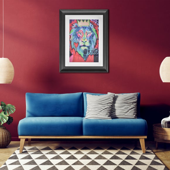 Add a pop of personality to your home with this framed canvas by Jessi Dahlquist. Featuring a colourful lion crowned as ‘King’, this piece blends bold street-art style with modern framing for a truly unique look. The gel resin detailing enhances texture and depth, making the artwork stand out beautifully. Finished in a sleek black frame, it’s ideal for creating a focal point in living rooms, bedrooms, or home offices. A must-have for those who love vibrant, contemporary décor.