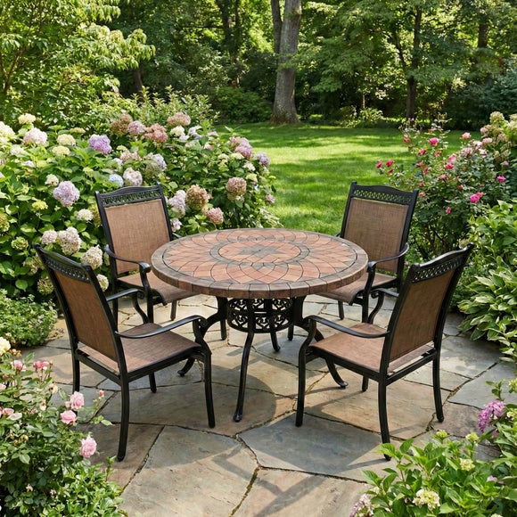 Perfect for contemporary gardens, this set pairs the decorative Larkson 100cm table with four highly practical Montrose chairs. The table’s warm mosaic-effect design is complemented by the sleek, black aluminium frames of the chairs, which feature supportive textilene seats. This combination is specifically engineered for outdoor longevity, offering excellent weather resistance and a modern aesthetic. The chairs require no assembly and are fully stackable, providing a versatile and low-maintenance seating solution that is ideal for family meals or entertaining friends on the terrace.