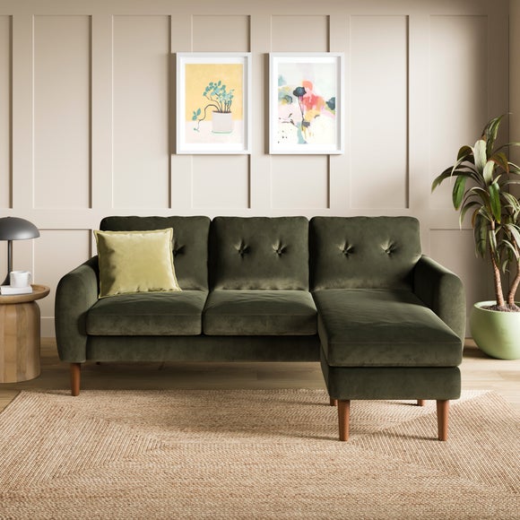 The Lola Velvet Curved Arm Corner Chaise Sofa brings a warm and contemporary feel to any living space. Its soft velvet fabric and curved arm design create an inviting silhouette that’s ideal for relaxed family lounging. Subtle button‑back detailing adds a stylish touch without overwhelming the look. The foam and fibre filling provides supportive comfort across both the main seat and the chaise section, and with walnut‑coloured wooden legs and an adjustable chaise position, it’s a versatile choice that fits beautifully into a range of interiors.