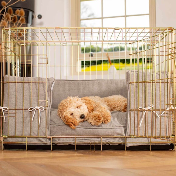 Create a cosy haven for your pup with the Lords & Labradors Inchmurrin Ground Pet Bumper Cushion Set. This stylish set includes a sturdy crate, plush bumper and a luxurious Inchmurrin cushion with a soft woolly texture for ultimate comfort. Built from 100% pet-safe galvanised metal with extra wire spacing, it’s strong, secure and perfect for crate training. Two doors with heavy-duty latches and a removable tray make cleaning easy, while the fold-flat design and carry handle keep storage simple. Handmade for lasting quality, it’s ideal for naps after walks, play or bath-time and you can even add a personal touch with customisation