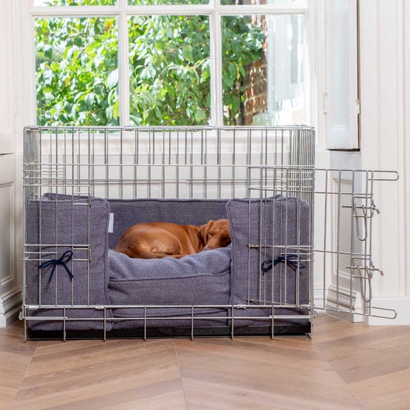 Give your pup a stylish and snug retreat with the Lords & Labradors Oxford Blue Herringbone Pet Bumper Cushion Set. Complete with a tweed cushion and bumper, this ready-assembled crate creates a cosy den they’ll love. Made from 100% pet-safe galvanised metal with generous wire spacing, it’s strong, secure and perfect for crate training. Two doors with heavy-duty latches and a removable metal tray make cleaning and access simple, while the fold-flat design and carry handle keep storage easy. The cushion is machine washable on a delicate cycle for fuss-free care.