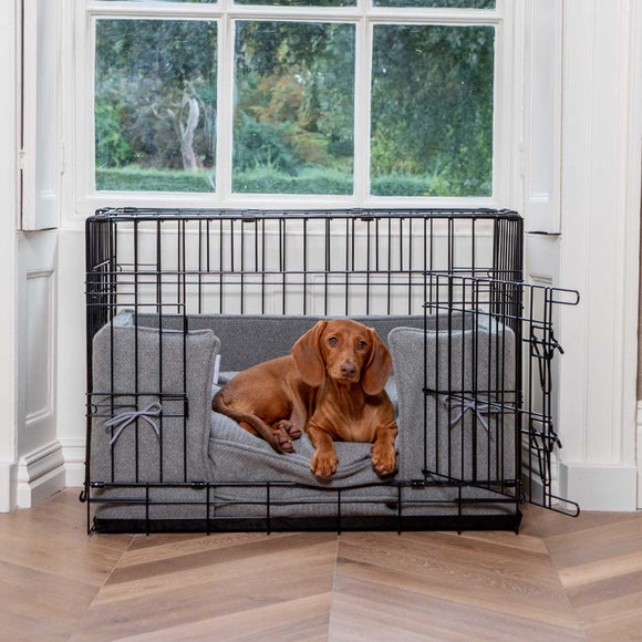 Give your pup a snug and stylish retreat with the Lords & Labradors Pewter Herringbone Pet Bumper Cushion Set. This set includes a sturdy crate, plush bumper and a beautifully handcrafted herringbone tweed cushion for timeless comfort. Made from 100% pet-safe galvanised metal with generous wire spacing, it’s strong, secure and perfect for crate training. Two doors with heavy-duty latches and a removable metal tray make cleaning simple, while the fold-flat design and carry handle keep storage easy. The cushion is machine washable on a delicate cycle for fuss-free care.