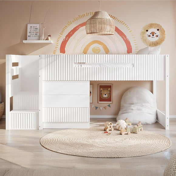 The Luca Midsleeper Bed Frame with 3 Drawer & 1 Chest brings sleep and storage together in a layout designed to make the most of compact spaces. Its raised bed creates room underneath for a matching chest of drawers, helping keep clothes, toys, and everyday essentials neatly organised. Built‑in side shelving offers quick access to books and décor, bringing extra practicality to busy bedrooms. The ribbed finish, available in all‑white or a white‑and‑oak combination, suits a wide mix of interior styles. A sturdy left‑hand staircase provides steady access to the sleeping area, offering reassurance for both kids and teens. With plenty of storage built in, it helps keep rooms tidy and ready for play, rest, and study.