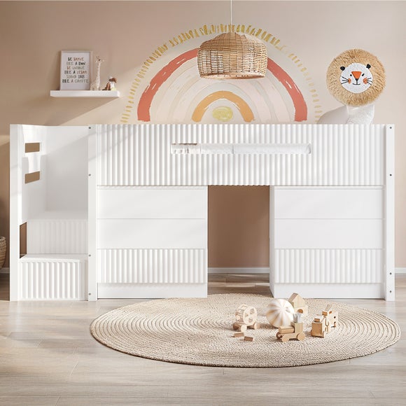 The Luca Midsleeper Bed Frame with 3 Drawer & 2 Chests is designed to make busy bedrooms work harder, bringing sleep and storage together in one smart setup. With the bed raised above two roomy chests, there’s plenty of space to tuck away clothes, toys, and those bits that always need a home. Side shelving adds even more practicality, keeping favourite books and decorations within easy reach. The ribbed finish, offered in all‑white or a white‑and‑oak mix, gives the piece a fresh, modern feel that fits effortlessly into different interiors. A sturdy left‑hand staircase helps create a steady climb to bedtime, ideal for growing kids and teens. Thoughtfully built, it keeps rooms organised while leaving more floor space free for play, creativity, and everyday living.